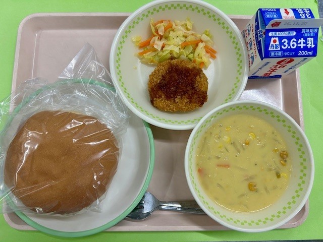 コーンをたっぷり使ったコーンミルクスープも人気です。1年生の先生から「あっという間に完食しました!」と嬉しい感想も教えてもらえました。