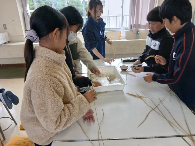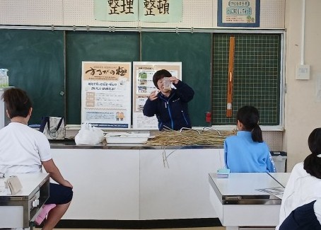 11月12日には、JAふじ伊豆さんの出前授業が行われました。子供たちは、「するがの極」についての講義を受けた後、脱穀と精米を手作業で行う体験をしました。籾が白米になるのは意外とたいへんな作業であることを学びました。12月には給食で「するがの極」が出される予定です。とても楽しみです。