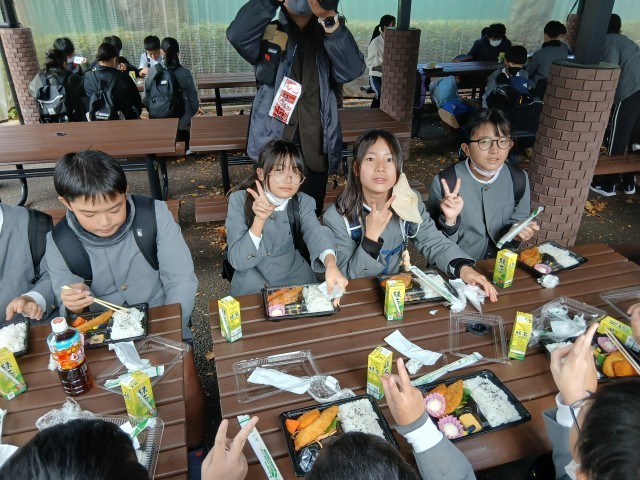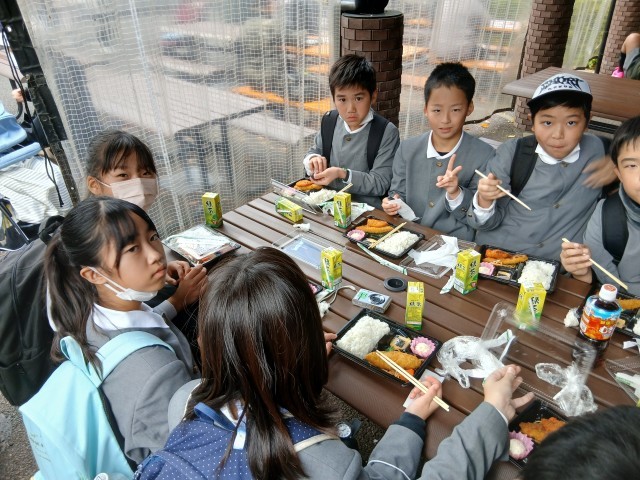 上野動物園で昼食をとっています。思ったよりも寒くないので、子供たちは笑顔でほおばっています。