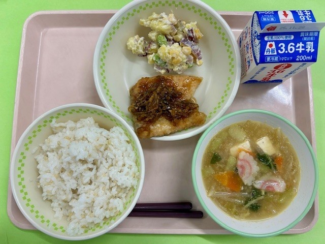 今日の駿東地区の食材は、清水町の緑米、長泉町でとれた白ネギ(根深ねぎ)でした。また近隣地域の食材として、富士宮市で養殖されているニジマス、沼津市のさつまいも、三島市のチンゲンサイを献立に取り入れました。