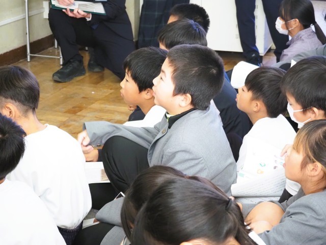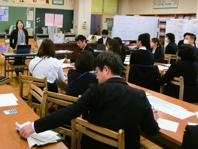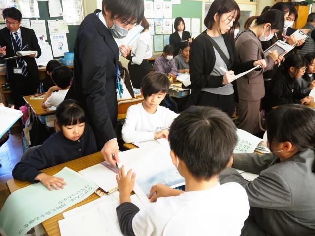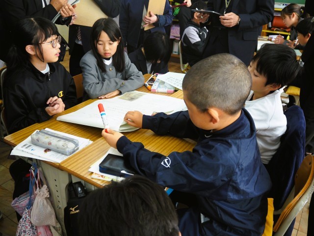 今日は、静東教育事務所から指導主事の先生(教員が行う授業について指導助言をしてくださる方)をお招きし、全クラスの授業を参観していただきました。また、3時間目の国語の授業は、全教員で参観し事後に研修を行いました。授業では、子供たちが知りたいと思って生まれた「問い」についてグループで話し合い、場面の叙述から考えた登場人物の気持ちの変化などを書き出し、クラス全体で共有しました。
