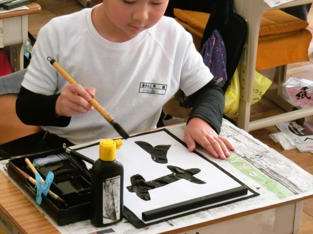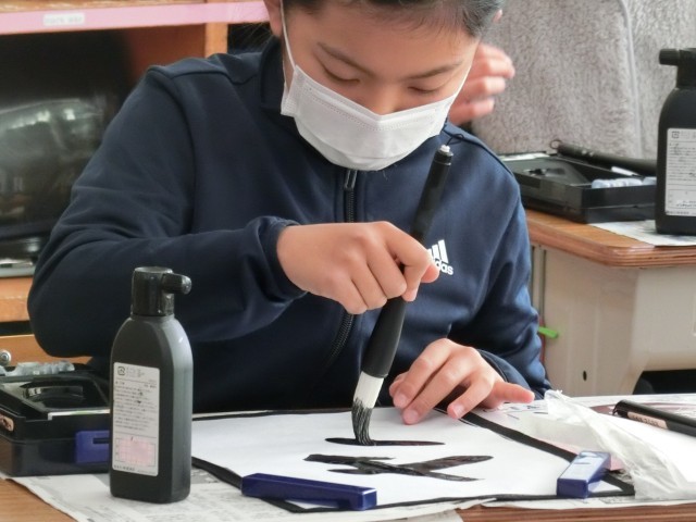 3年生の書写の授業では、書き初めの練習をしています。今年の課題は「花がさく」。今日は通常の半紙に一文字ずつ「とにかく大きく書いてみよう」という声かけに、どの子も丁寧に取り組んでいました。