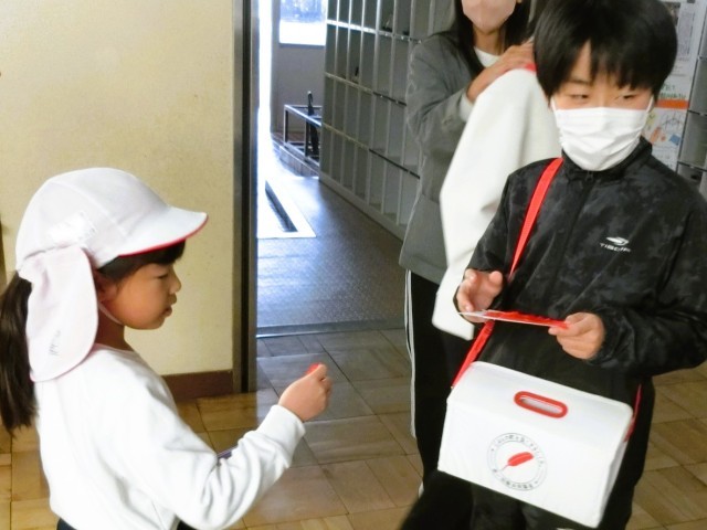 今週、昼休みの時間帯に、6年生が赤い羽根募金を募っています。6年生が募金について放送してくれたこともあり、少しずつ、じわじわと子供たちの間で募金活動が広まっています。募金で集まった協力金は、赤い羽根共同募金へ寄付し、地域の福祉に役立てられます。清水小では今週金曜日まで行います。