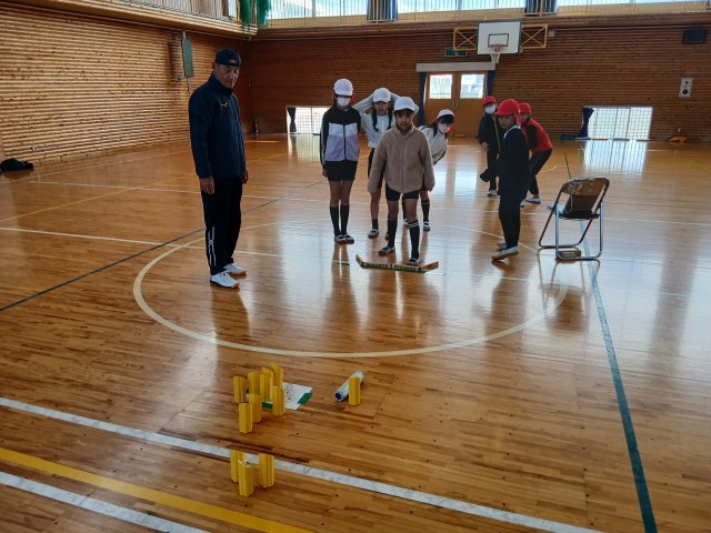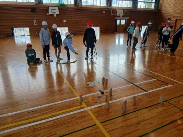 5年生が、フィンランド発祥のニュースポーツ「モルック」を体験しました。