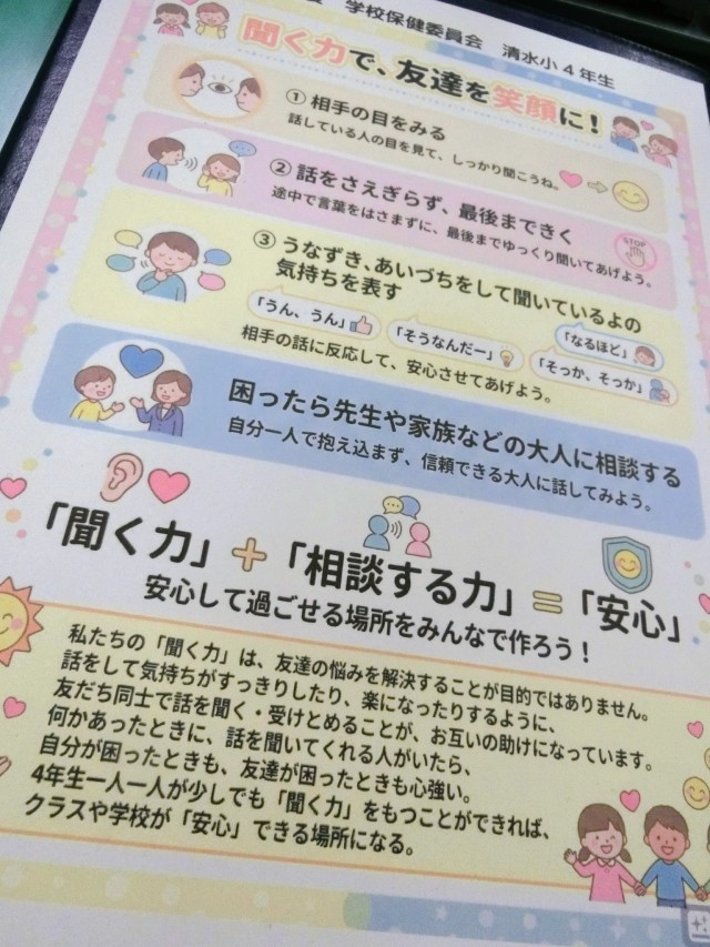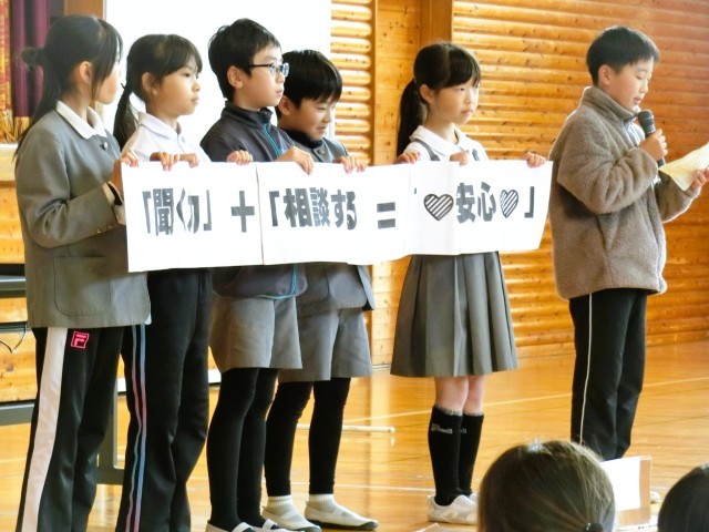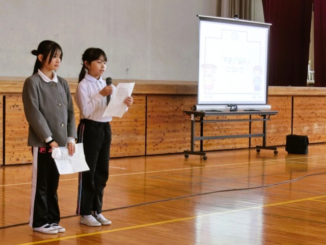 先週、本校学校医の医師とスクールカウンセラーをお招きし、学校保健委員会を開催しました。学校保健委員会は児童の健康の保持増進や学校における保健安全について協議等を行い、学校保健の一層の充実・向上を図ることを目的とします。会では4年生の代表児童が、友達の悩みや不安な気持ちを和らげるには、どんな聞き方がよいかを実演してくれました。スクールカウンセラーからは相談することの大切さと、相談するときには、友達の他に、お家の方や先生・お医者さん・カウンセラーなど「先に生まれた人」=「先人」に相談することをお勧めされました。1人で悩みを抱えずに、友達や先人に相談することで、より安心な学校生活にしていきましょう。