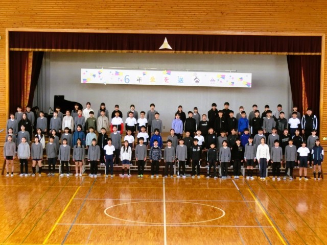 今日は3・4時間目に全校児童で6年生を送る会を行いました。今日まで、6年生に向けて、1~4年生は当日のパフォーマンスの準備を、5年生は全ての運営や会場飾り、事前に会を盛り上げるための昼の放送企画など、時間をかけて進めてきました。