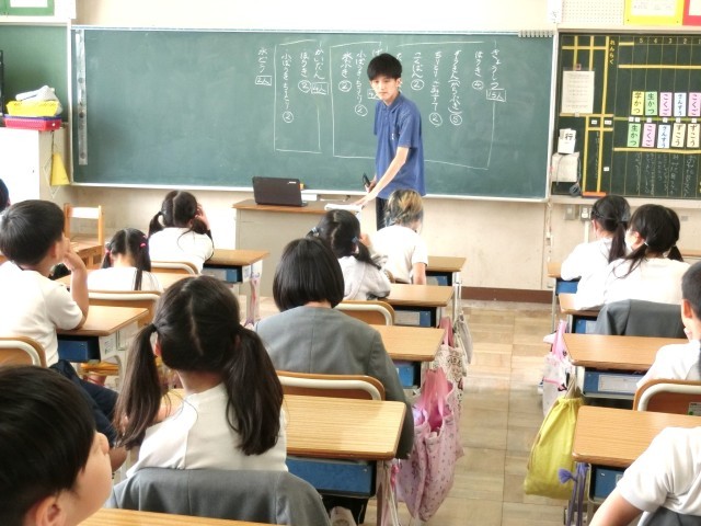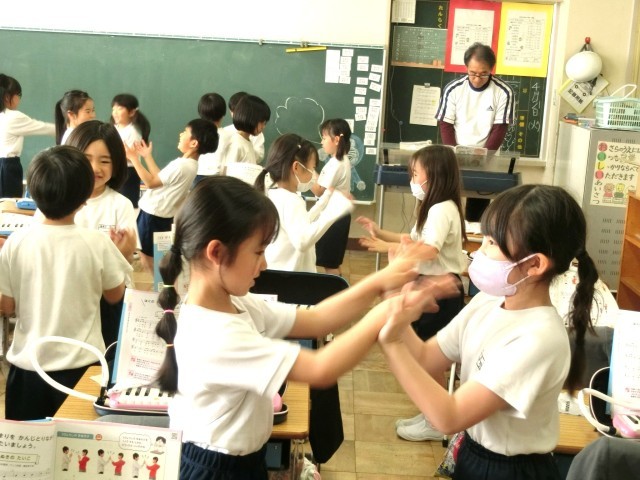 2年生の音楽の授業では、はくのまとまりを感じ取り、友達と手拍子を打ったり手を合わせたりしながら歌を歌いました。リズム(はく)を感じながら息を合わせて動作に集中すると、歌を歌うのを忘れがちになり難しさと楽しさで笑顔があふれていました。