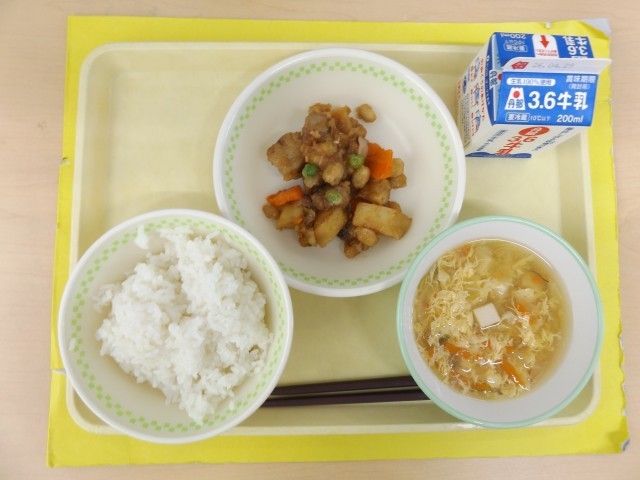 かきたま汁は春キャベツや玉ねぎなどの野菜がたくさん入り、調理員さんがふわふわの卵になるよう慎重に仕上げてくれました。