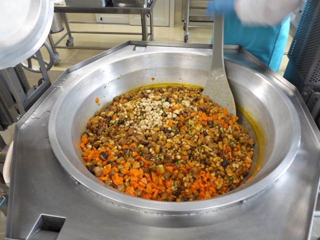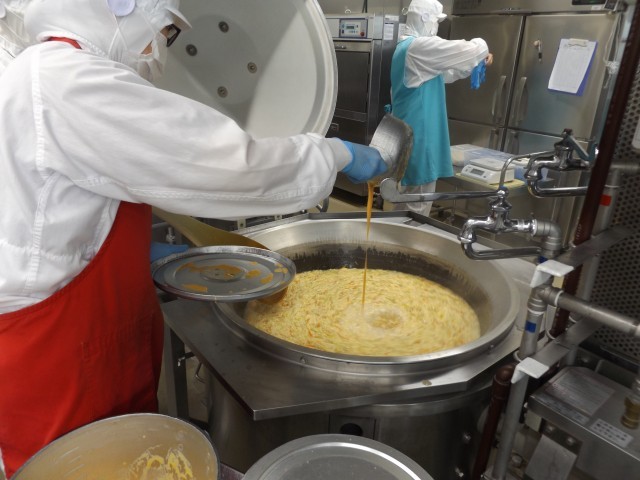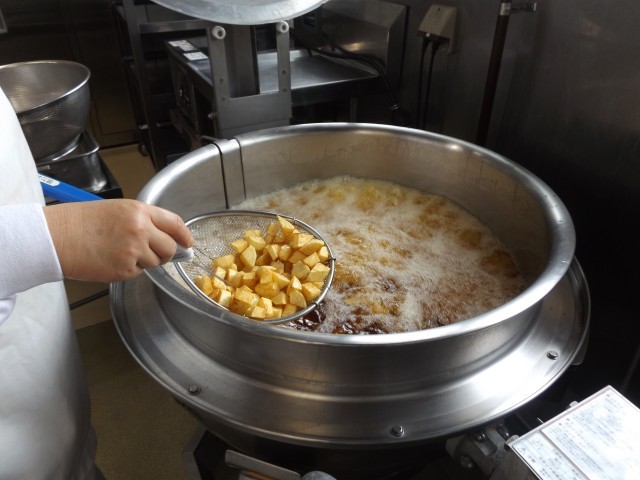 今日のカツオのあげにでは、県内産のカツオを使用し、じゃがいも、大豆、人参、グリンピースと一緒に釜で絡めました。