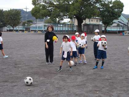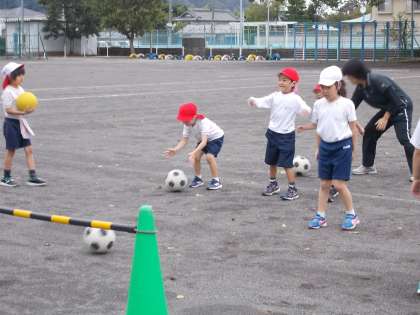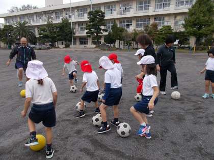 ボールを使ってステップをしたり、ゴールに向かって思いっきりボールを蹴って楽しんでいました。ボールの蹴り方も教わっていました。
