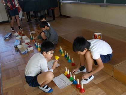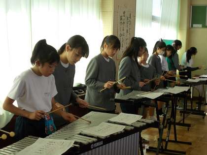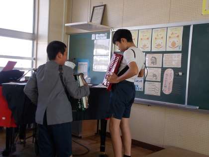 和音にあわせて伴奏にあう旋律にリズムをくわえてみようという授業です。自分が考えた和音のリズムを木琴、鉄琴、オルガン、ハンドベル、アコーディオンなどさまざまな楽器をつかって演奏していました。慣れない楽器もあり、何度も練習をしていました。