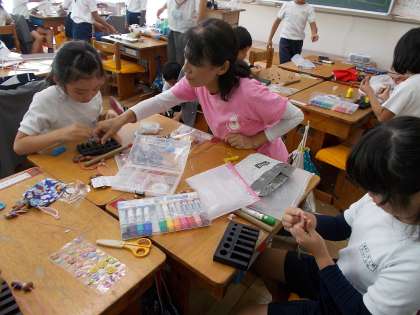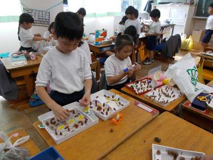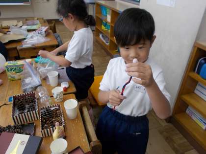 どんぐりやまつぼっくりを使ってケーキやおみくじ、つり、めいろ、マラカス、コマなどを作っていました。今回は担当の品物を目標を決めて取りかかっていました。たとえばコマ屋さんは1分まわるコマをたくさん作るなど研究したり、友達と試してみたりしていました。