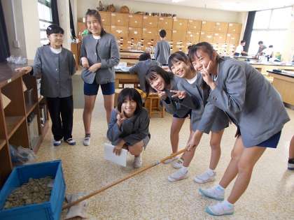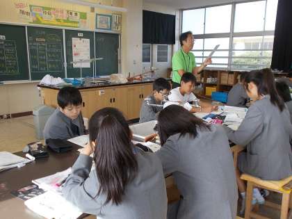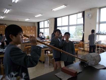 少ない力で持ち上げられるかを考えようという内容でした。実際に重い石やがれきが入った箱などを持ち上げて、力点、作用点、支点の距離の関係を実験で確認し、軽い、重いなどの違いがあることがわかりまとめていました。