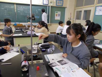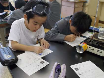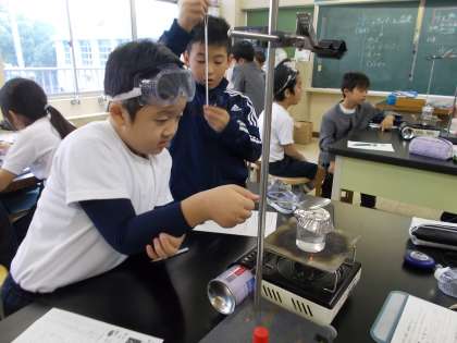 「水のすがたと温度」という授業を行っていました。ビーカーに水を入れて0〜15分まで熱し1分ごとに温度を測定。みんなの予想は200度まであがるでしたが結果は98度程でした。グループによっては99度まであがったよ!と嬉しそうに教えてくれました。