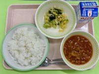 ごはん、ぎゅうにゅう、ぶたキムチいため、コーンいりかきたまスープ