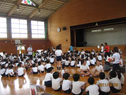 6/8(水)スマッピー出会いの会が行われました。クラスごと、1〜6年の縦割り12グループに分かれ、自己紹介、対抗ゲームをしました。初めてでしたが、すぐに仲良くなり楽しいひとときを過ごしました。