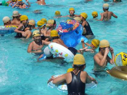 9/7(水)4時間目に、6年生と1年生がペアでプールに入りました。