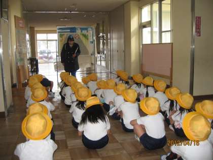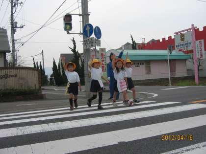 4月16日(月)に1年生の交通教室がありました。交通指導員さんに、安全な登下校の仕方を教えてもらった後、実際に道路を歩いてみました。特に横断歩道の歩き方は何度も確認して行いました。「右左よく見て横断、交通安全」