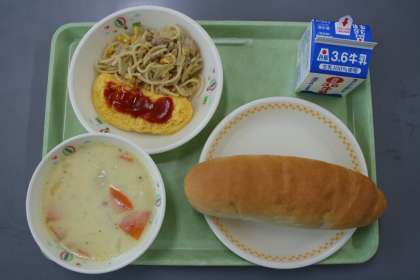 ロールパン オムレツ スパゲッティ入り野菜ソテー コーンスープ 牛乳 でした。