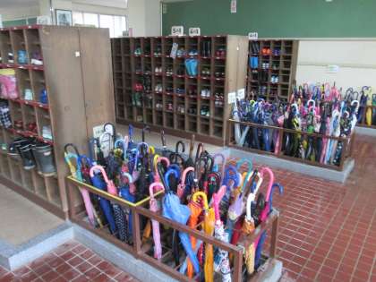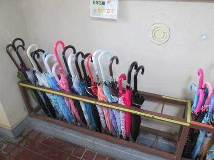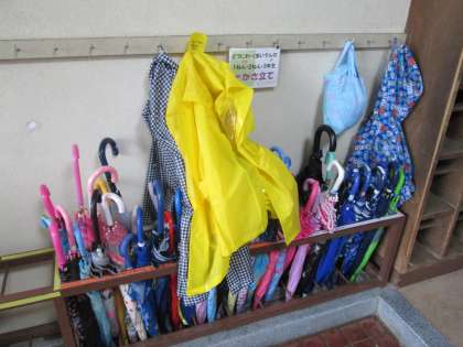 一人一人の子どもたちが、「トン、トン、くるりん」と傘をたたんで傘立てにしまっていきます。きれいに、しまうことで後から来る子どもたちも利用しやすくなっています。大切な習慣ですね。