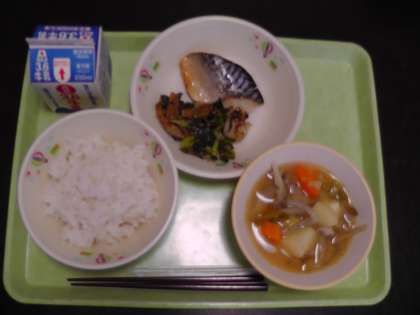 麦ご飯 牛乳 鯖の塩焼き 小松菜とさつま揚げのごま炒め