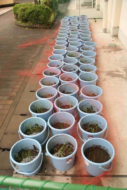 5年生が、総合的な学習の時間で、バケツ稲作りを始めました。