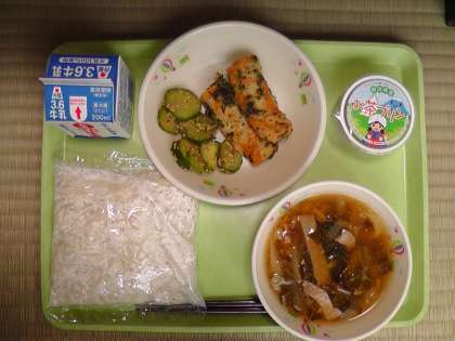 平うどん 牛乳 竹輪のお茶揚げ きゅうりのごまみそあえ