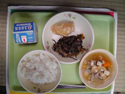 麦ご飯 牛乳 鶏肉のわさび味噌焼き カラフルひじき炒め