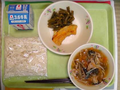 平うどん 牛乳 うどん汁 かぼちゃの天ぷら いんげんの煮浸し