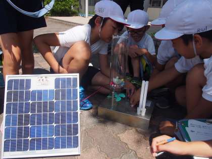 2時間目に4組は光電池のはたらきについて学習しました。鏡を使って光を集め、メロディーやプロペラがどれだけ鳴ったり回ったりするか調べました。