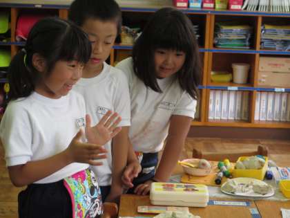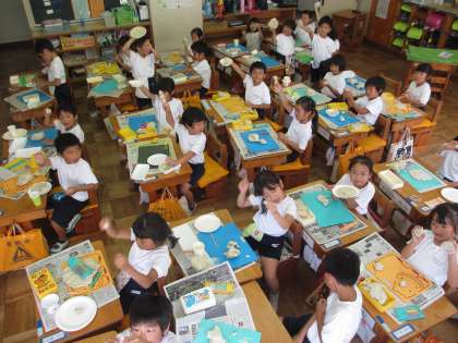 先週1年生は図工で「ごちそう パーティーを はじめよう」という粘土を使った工作をしました。自分の考えるごちそうでみんなと楽しくパーティーです。いろんなごちそうができたね!