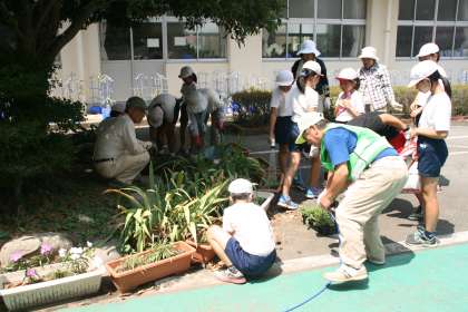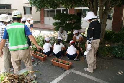 昼休みに、園芸委員会の子どもたちと、地域(久米田地区)の花の会の