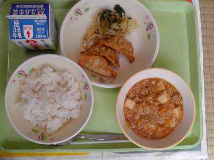 麦ご飯 牛乳 麻婆豆腐 揚げ餃子 青梗菜の和え物 でした。