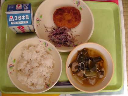 麦ご飯 牛乳 大豆コロッケ もやしとキャベツのゆかり和え いわしだんごのみそ汁