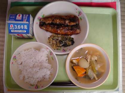 麦ご飯 牛乳 いわしの蒲焼き ほうれん草とキャベツのごま和え じゃがいもと玉ねぎのみそ汁