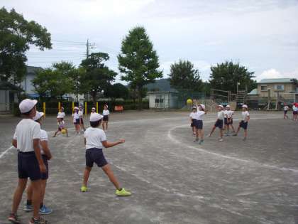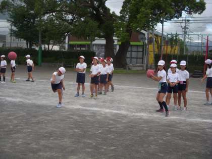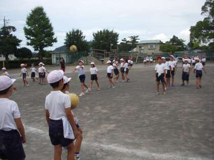 くすのきタイムの朝運動で「ドッジボールラリー」を行いました。3分間で70回くらいのパス交換ができました。みんなで声を出して数を数えたり、相手の胸に向かって投げたり、気持ちのよい汗を流しました。