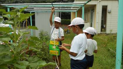 子どもたちは休みの間に大きくなったヒマワリを見て驚いていました。