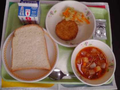 ミネストローネは給食でよくでる献立です。ベーコン、じゃがいも、玉ねぎ、人参、大根、トマト、パセリ、スパゲティが入っています。大根や人参などの野菜はサイコロの形に切りそろえることで、見た目にもみそ汁とは違う洋食の1品になります。調理員の一手間のおかげです。