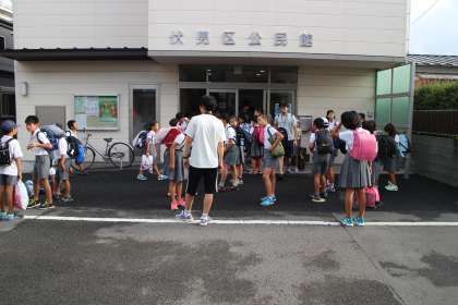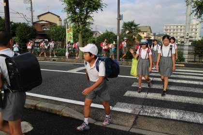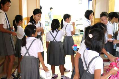 6時15分起床。朝食後、みんなで歯みがき。 みんなで、なかよく集団登校です。