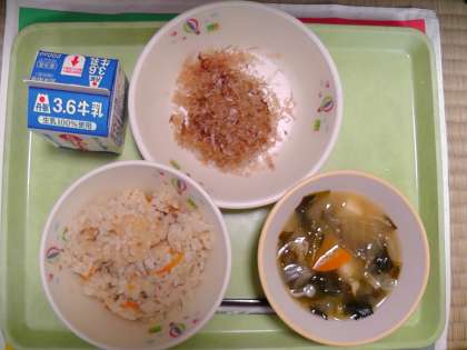 鶏ごぼうご飯 牛乳 キャベツ入り平つくね 豆腐のみそ汁