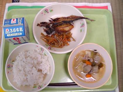 麦ご飯 牛乳 あじの干物の素揚げ きんぴらごぼう 里いものみそ汁