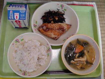 麦ご飯 牛乳 鯖の唐揚げ ひじきの炒め煮 油揚げのみそ汁