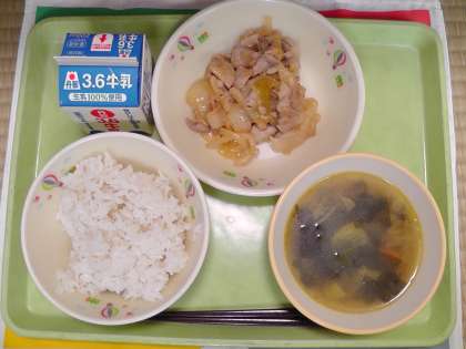 麦ご飯 牛乳 豚の生姜焼き わかめスープ