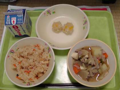 ツナ入り五目炊き込みご飯 牛乳 コーン入り焼売 豚汁