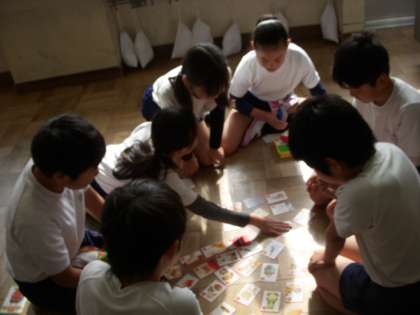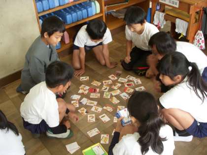 国語の学習で、ことわざ、四字熟語、故事成語の学習を行います。今日は、ことわざに親しむことを目的に「いろはかるた」を行いました。最後に「い」は何?「え」は?と聞くと、多くの子が手を挙げて答えました。