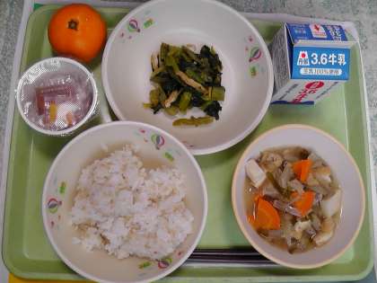 緑米入りご飯 牛乳 納豆 小松菜と油揚げの煮浸し 根っこ野菜のみそ汁 みかん