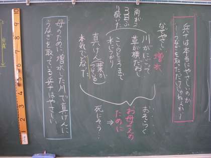 授業では、「兵十は優しい」とまとめたところ、「うなぎをとっただけで、優しいのか?」と子どもから疑問が投げかけられました。そこで、うなぎをとった場面から、