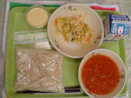 ソフトめん 牛乳 ミートソース コールスローサラダ 手作りプリン