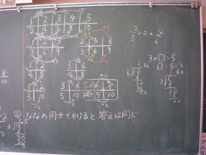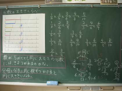 4年生は分数の学習を行っています。図を見ながら、数が違うのに同じ大きさの分数があることに気付いた子どもたちが、同じ大きさの分数には、どんなきまりがあるのか考えました。すると以前学習した「計算のきまりを考えよう」で出てきた表の関係と似ていることに気付きました。また、小数のわり算を使って、分子と分母、それぞれ1.5倍の関係になっている組もありました。今までの学習を生かし新たな発見をしていました。