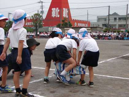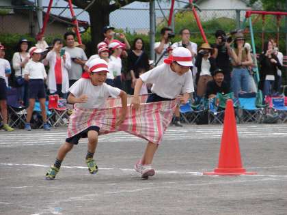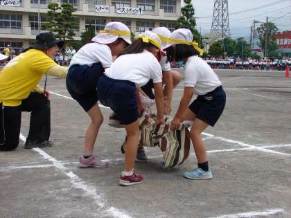 2年生の団競は「それいけ!デカパンマン!」です。2人の気持ちを合わせるのはもちろんですが、この競技で大切なのは次との引き継ぎの部分です。次の人のことを考えてデカパンを広げたりゴムの部分を最後にぐっと引き上げたりと、息が合えばスムーズにつながります。